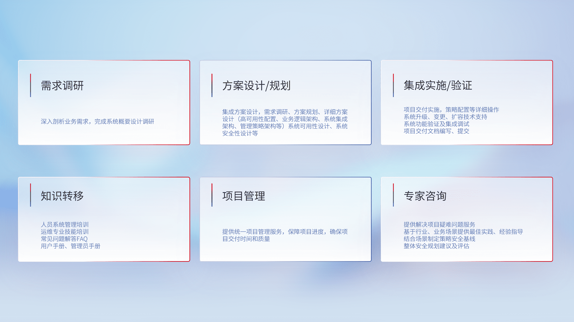 针对客户行业特性,,,,将宏观的安全战略和需求,,,通过专业的交付服务,,实现项目落地,,,,为客户提供标准规范的集成交付服务。。